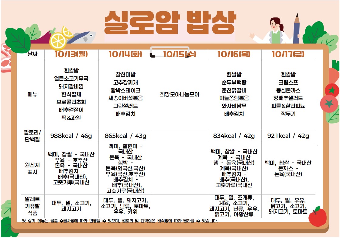 2025년 10월 3주차 식단 (10/13~10/17) |