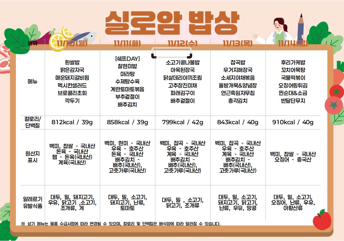 2025년 11월 2주차 식단 (11/10~11/14) |