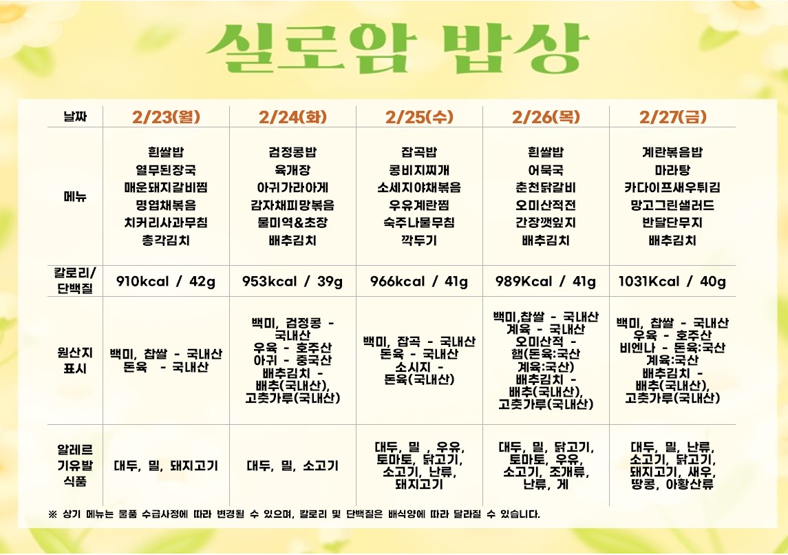 2026년 2월 4주차 식단 (2/23~2/27) |