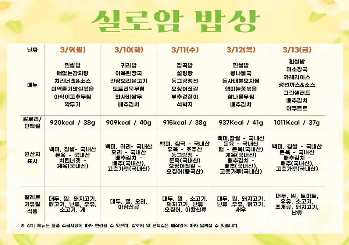 2026년 3월 2주차 식단 (3/9~3/13) |
