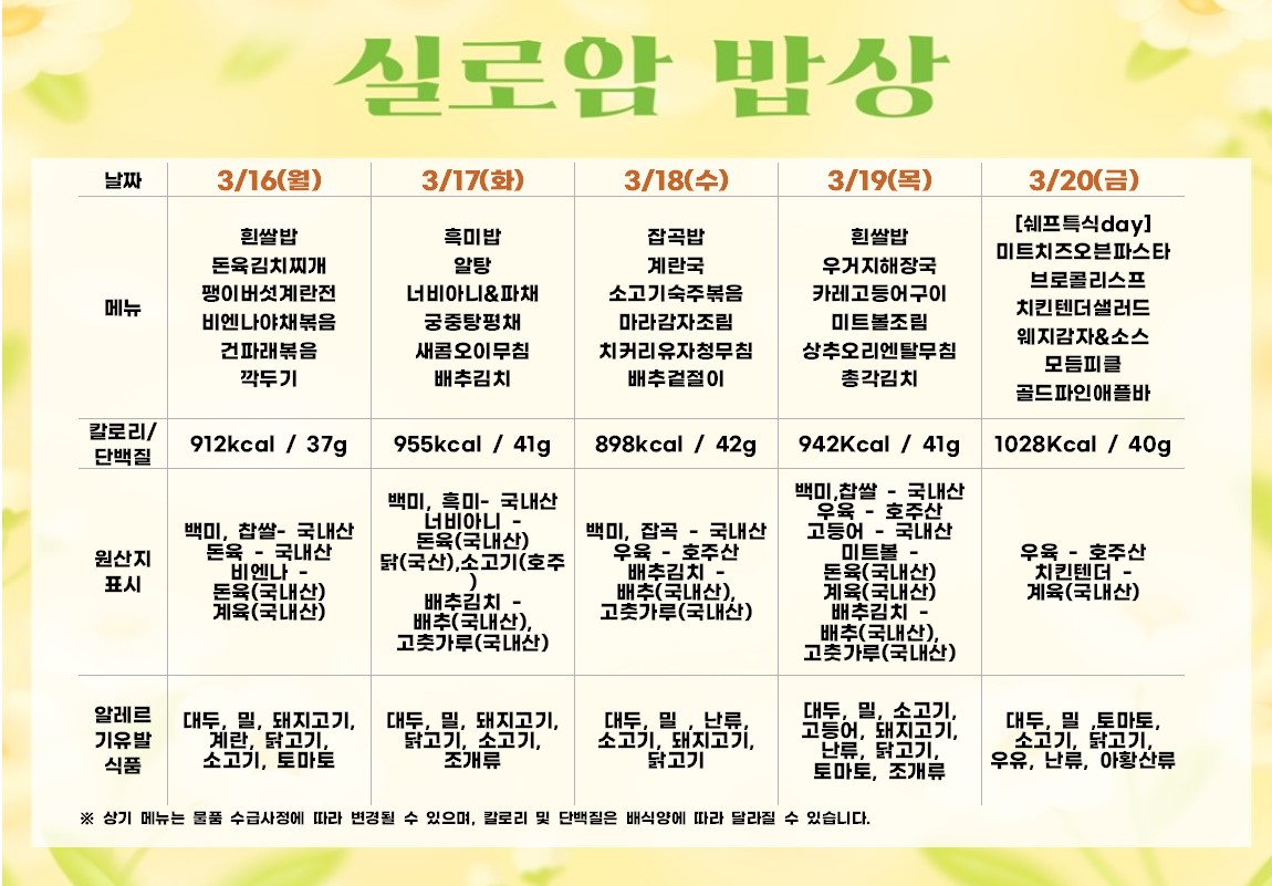 2026년 3월 3주차 식단 (3/16~3/20) |