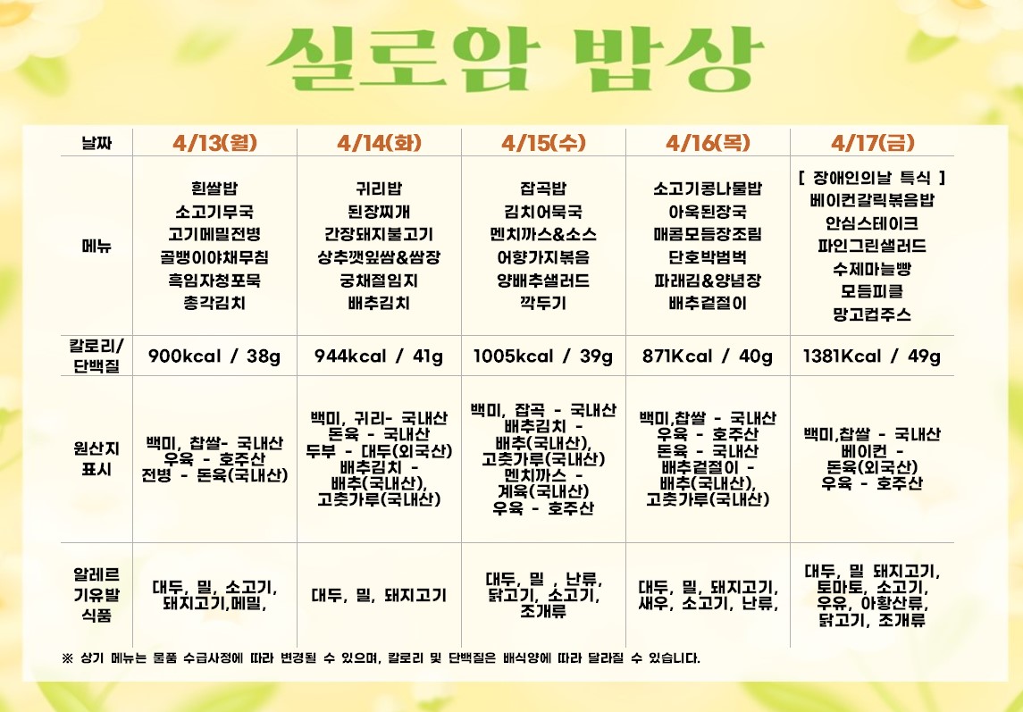 2026년 4월 3주차 식단 (4/13~4/17) |