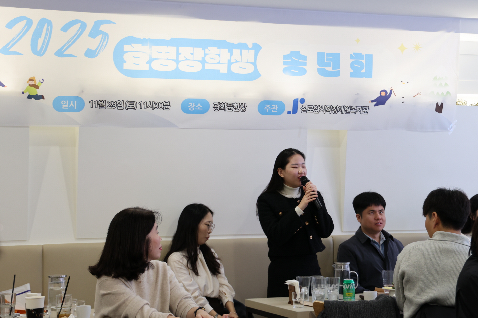11월 29일 토요일, 실로암시각장애인복지관에서는 효명장학생 선후배와 가족, 내빈 및 직원 60여명이 함께한 2025 효명장학생 송년회를 진행하였습니다.