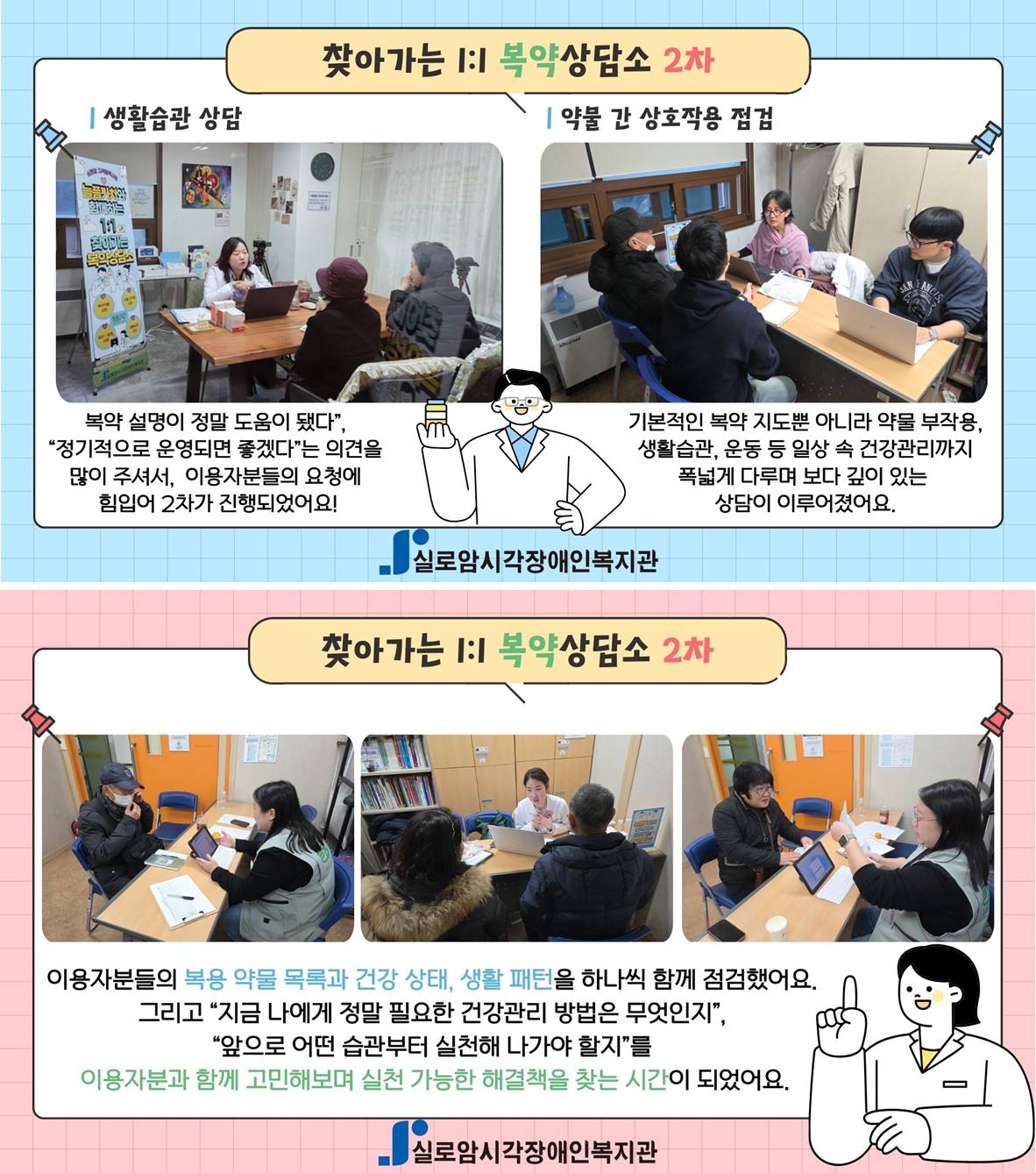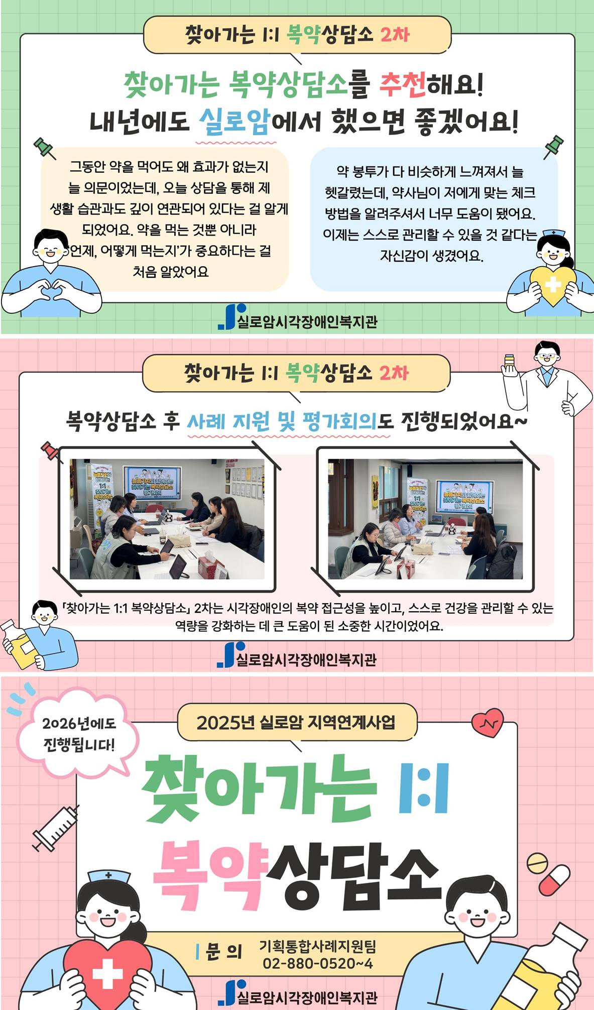 이번 「찾아가는 1:1 복약상담소」 2차는 시각장애인의 복약 접근성을 높이고, 스스로 건강을 관리할 수 있는 역량을 강화하는 데 큰 도움이 된 소중한 시간이었어요. 앞으로도 실로암시각장애인복지관은 늘픔가치와 함께 건강상담 및 복약관리 프로그램을 꾸준히 운영하며, 시각장애인의 건강한 일상을 응원하겠습니다. 시각장애인의 건강한 삶을 함께 만들어가고 싶은 기관이나 단체는 언제든지 기획통합사례지원팀(02-880-0520~4) 으로 연락주세요 :)