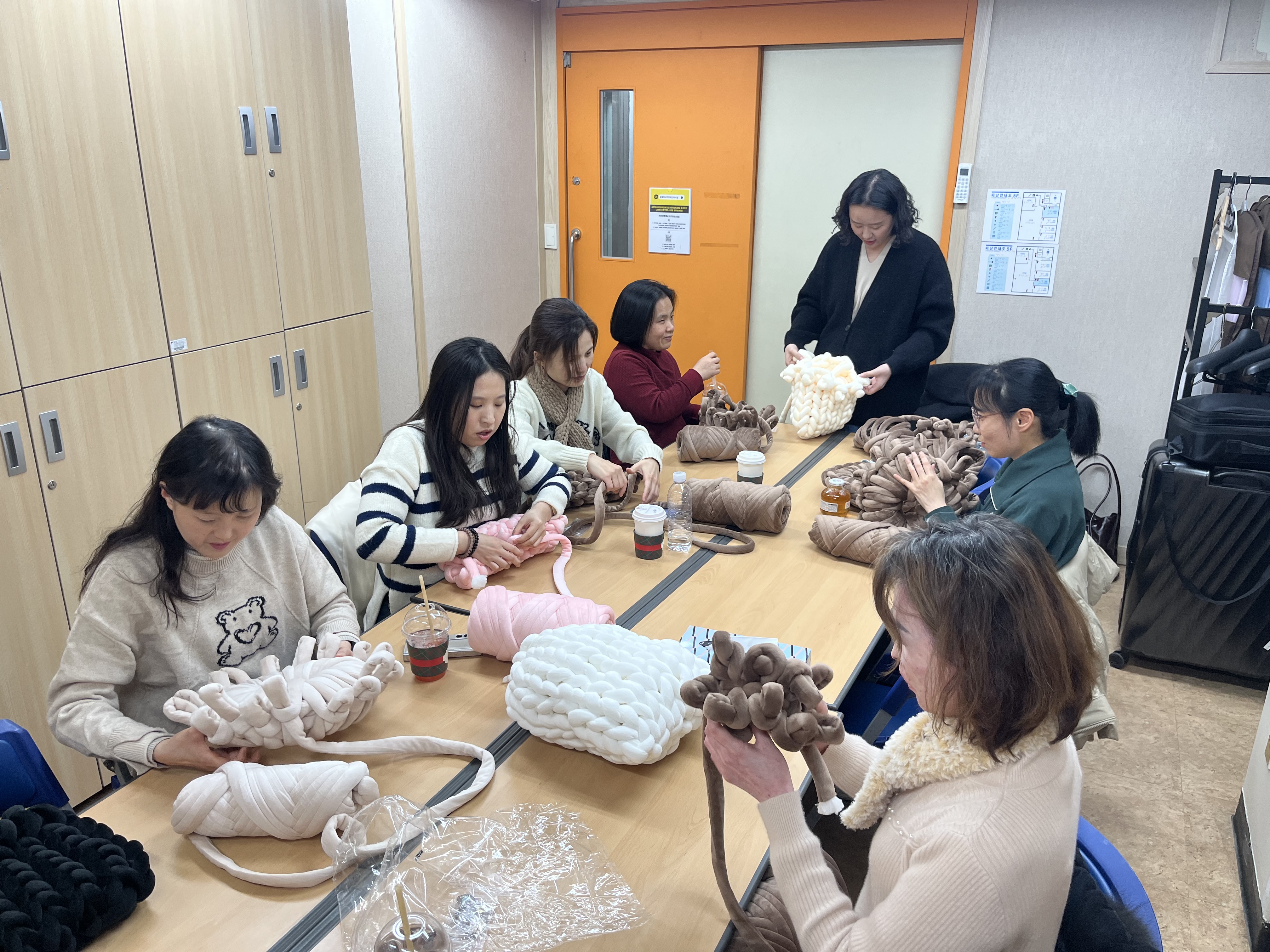 긴 시간 함께 해주시는 동안, 여러 번의 교육을 통해 핸드니팅 기법을 꼼꼼히 익힐 수 있어 좋았다는 감상, 겨울에 잘 어울리는 소품을 만들 수 있어 좋았고 같이 만들기를 하며 이야기를 나누는 시간이 힐링 되었다는 감상을 남겨주셨습니다.주변에 선물한 뒤의 반응 등을 수업 전 화기애애하게 나누며 뜻깊은 시간을 보냈습니다. 강사님께서도 교육생분들이 많은 질문을 해주시며 열심히 만들어주는 모습에 힘이 난다고 첨언해주셨습니다.