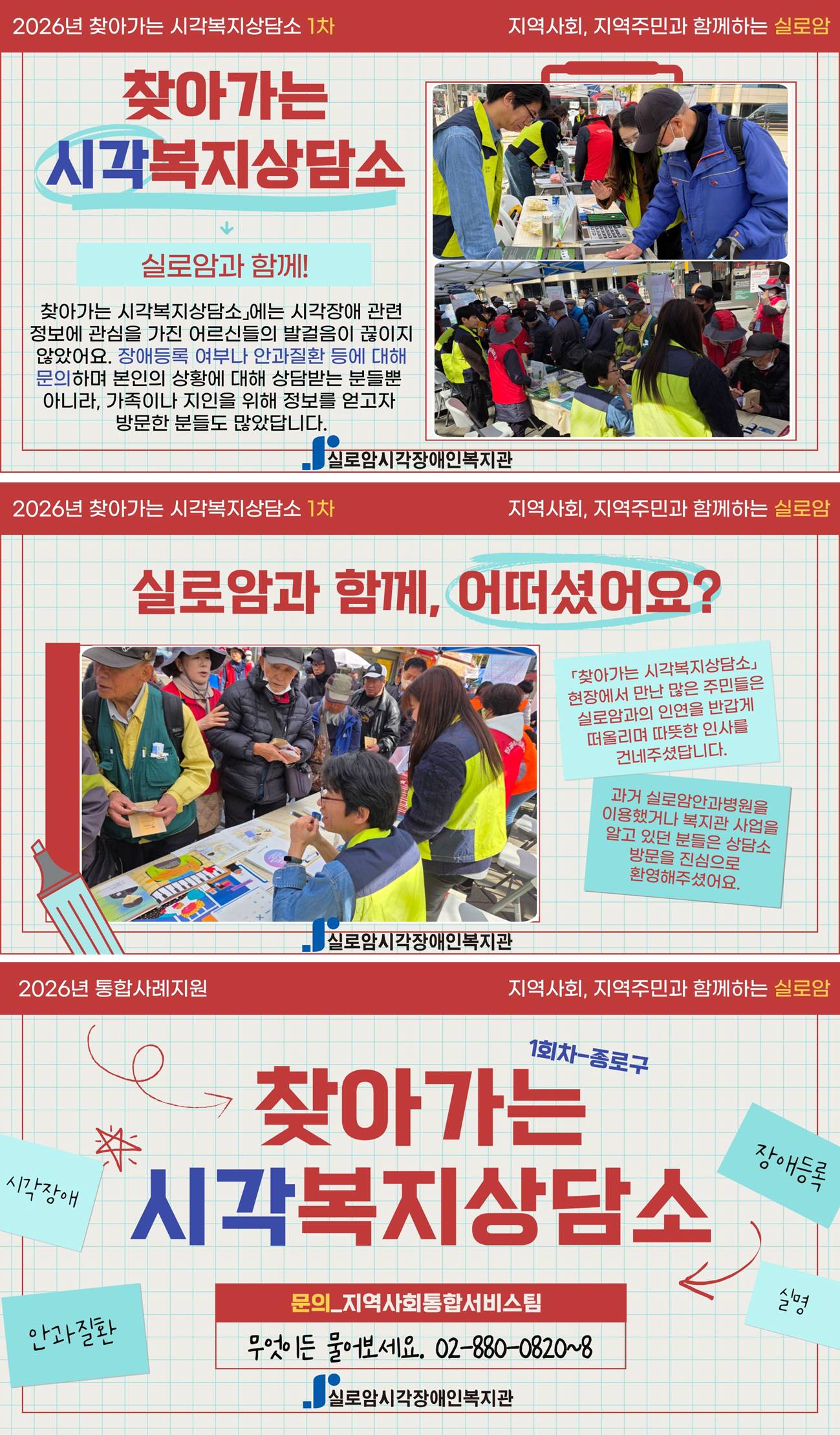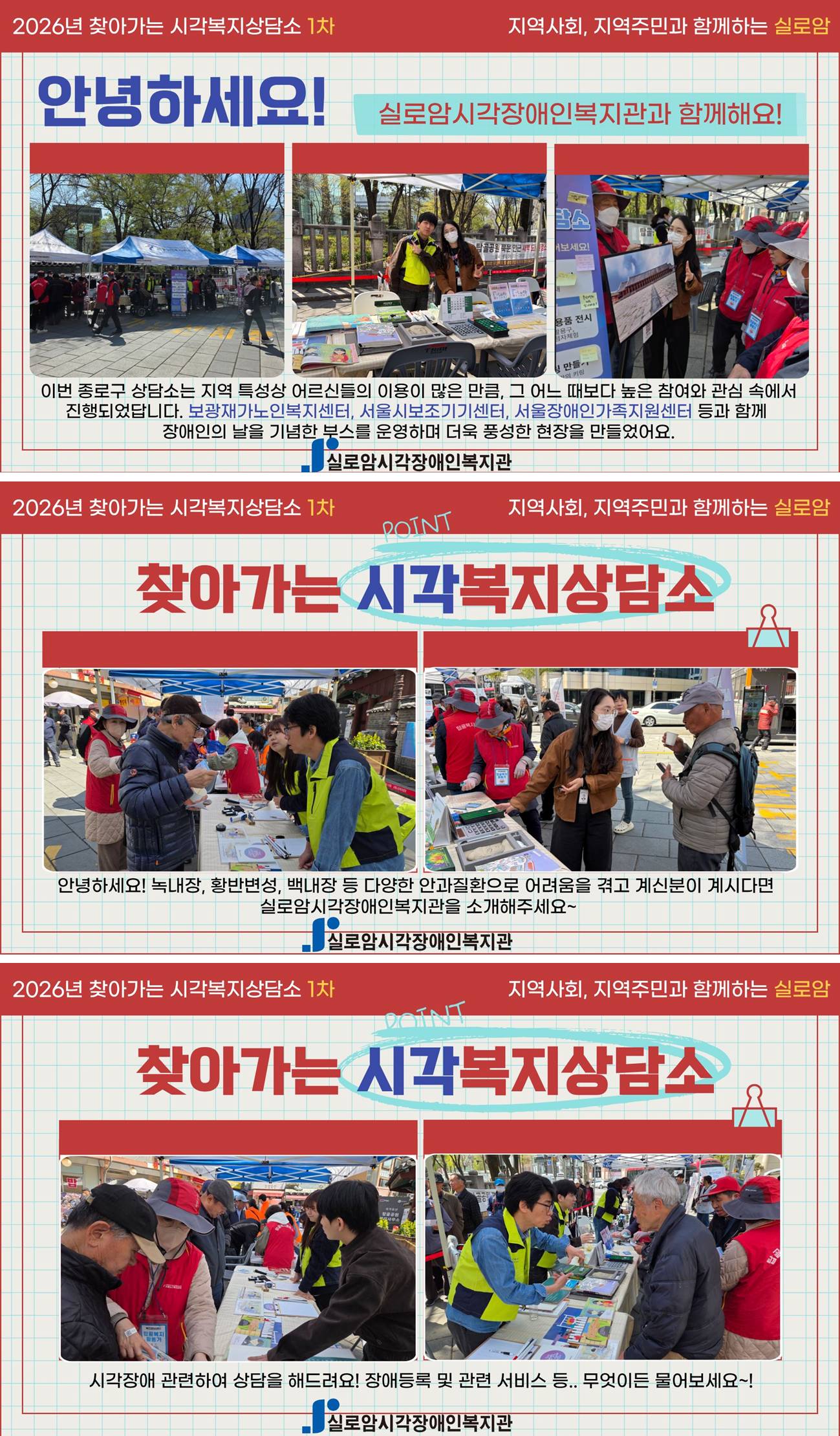 단순한 홍보를 넘어 지역사회와 직접 마주하며 이야기를 나누는 「찾아가는 시각복지상담소」는 앞으로도 정보 접근이 어려운 지역과 소외된 이웃을 위해 지속적으로 운영될 예정이에요. 실로암은 지역 내 다양한 기관 및 주민들과 함께하며, 시각장애인이 지역사회 구성원으로 자연스럽게 어우러질 수 있는 환경을 만들어갈 예정이에요. 이번 종로구에서의 만남을 시작으로, 도움이 필요한 곳 어디든 찾아가는 실로암의 발걸음은 계속될 예정이랍니다. 협업이나 참여를 희망하시는 분들은 언제든 지역사회통합서비스팀(02-880-0828)으로 문의해주시기 바랍니다. 실로암이 함께할게요!