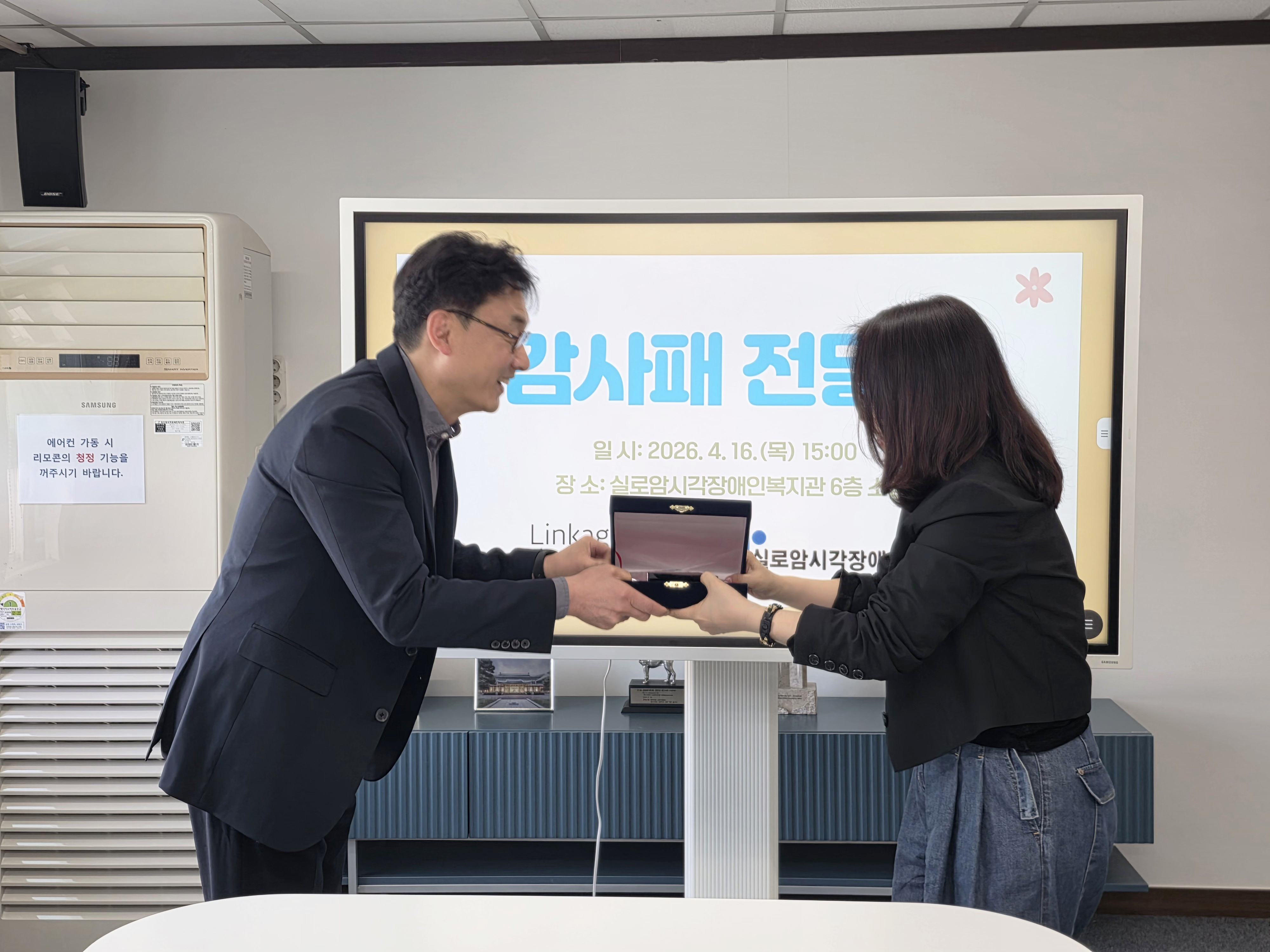실로암시각장애인복지관 직업재활센터는 장애인 고용 연계 및 일자리 창출을 위해 협력해 온 링키지랩으로부터 감사패를 전달받았습니다.