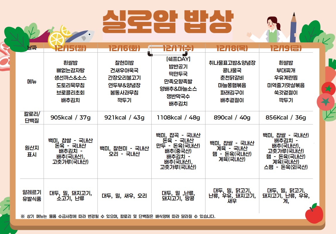 2025년 12월 3주차 식단 (12/15~12/19) |