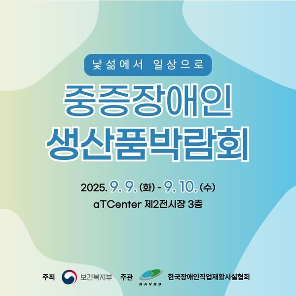 장애인신문·웰페어뉴스=정유정 기자 | 보건복지부와 한국장애인직업재활시설협회는 오는 9월 9일부터 10일까지 양재동 aT센터 제2전시장에서 '2025 중증장애인생산품 박람회'를 개최한다.