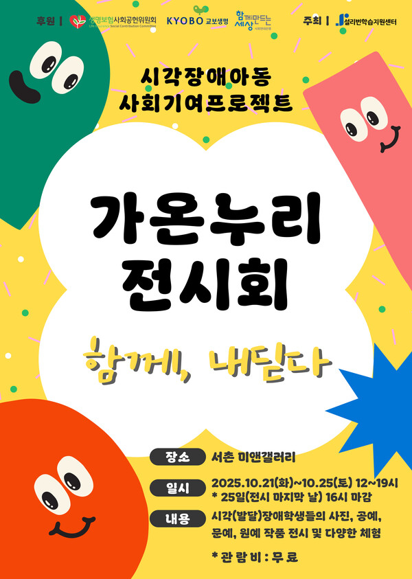 설리번학습지원센터가 2025년 생보위와 교보생명이 지원하는 비영리부문 공익활동의 일환으로 추진된 시각발달아동청소년 역량강화 프로그램 ‘사회기여 프로젝트’의 마지막 단계인 가온누리 전시회를 오는 21일부터 25일까지 서울 종로구 미앤갤러리에서 개최한다.