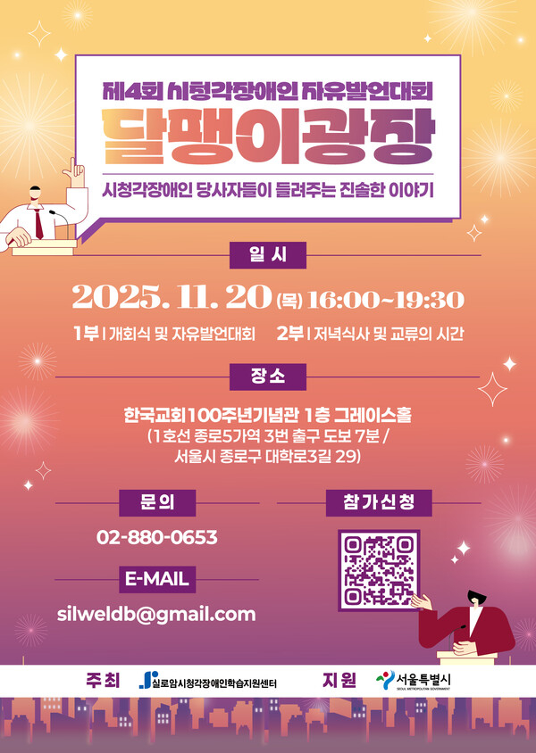 실로암시청각장애인학습지원센터가 오는 20일 오후 4시 한국교회 100주년기념관 1층 그레이스홀에서 ‘2025년 제4회 시청각장애인 자유발언대회 달팽이광장’을 개최한다.